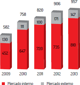 A receita líquida consolidada atingiu R$ 957,3 milhões, 5,6% maior que em 2012. As vendas no mercado interno chegaram a R$ 810,3 milhões em 2013, acréscimo de 10,2% na comparação com 2012, devido ao aumento da demanda por fibrocimento e mineral crisotila e à política comercial adequada. No mercado externo as vendas somaram R$ 147,0 milhões, retração de 14,0% em relação a 2012, em razão, principalmente, do volume vendido e não embarcado de crisotila, parcialmente compensado com aumentos de preços e valorização de 10,3% do dólar perante ao real (comparação entre ptax médio do período).